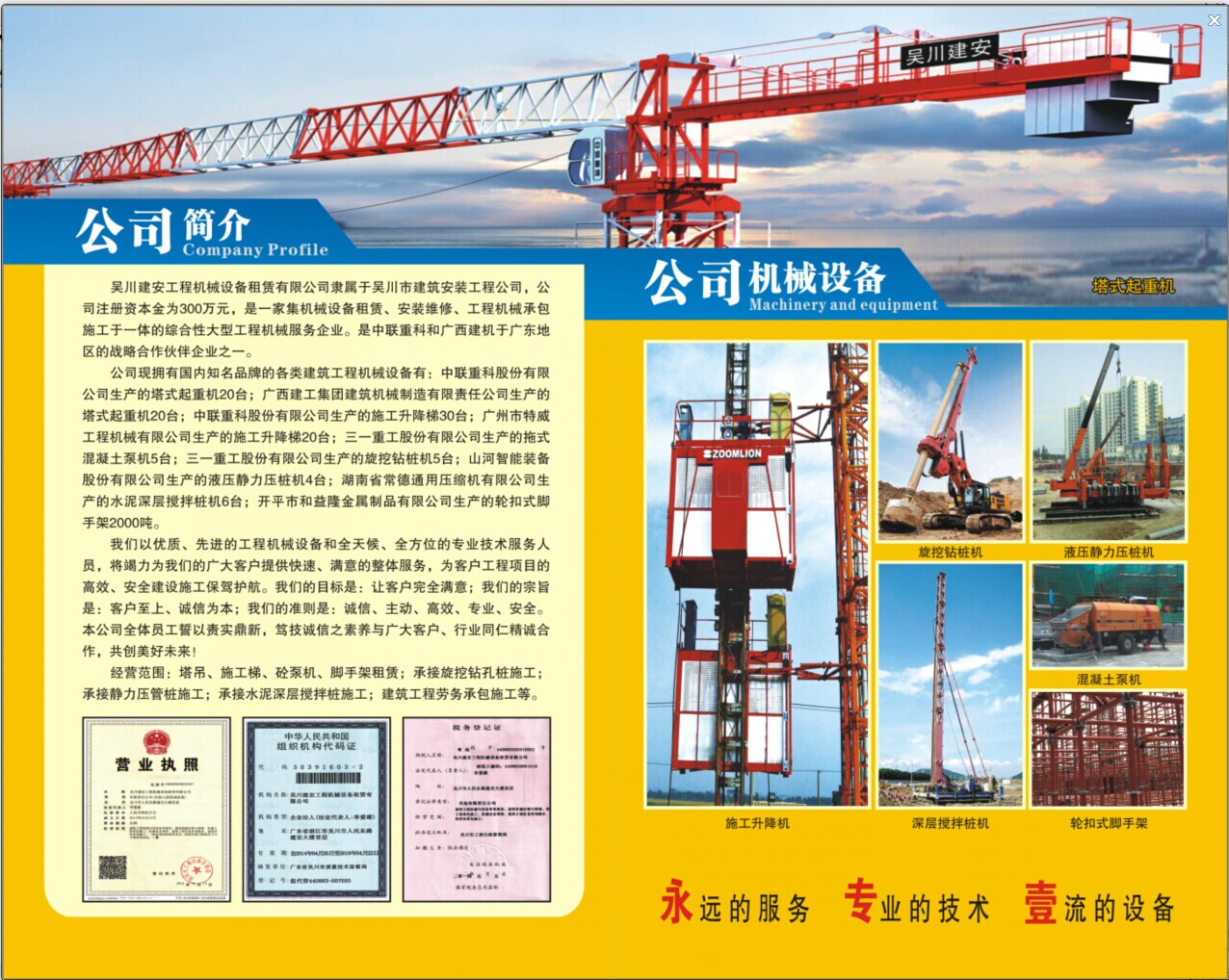 公司經(jīng)營范圍:塔吊、施工電梯、砼泵機(jī)、腳手架租賃;承接旋挖鉆孔樁施工;承接靜力壓管樁施工 ;承接水泥深層攪拌樁施工;承接建筑工程勞務(wù)承包施工等。